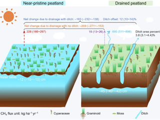 泥炭地作为全球重要的碳汇,常因排水活动而受到影响。虽然排水活动总体上减少了甲烷的排放,但伴随排水而修建的沟渠却成为潜在的甲烷排放热点。然而,在不同气候带和土地利用类型下,沟渠对甲烷排放的抵消作用尚不明确。为解决这一问题,我们开展了一项全球荟萃分析,收集了近原始泥炭地、排水泥炭地及其沟...